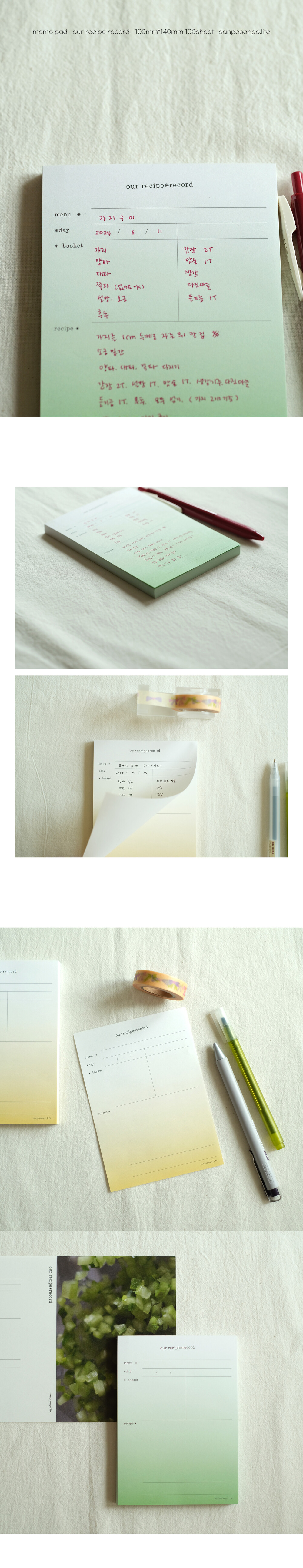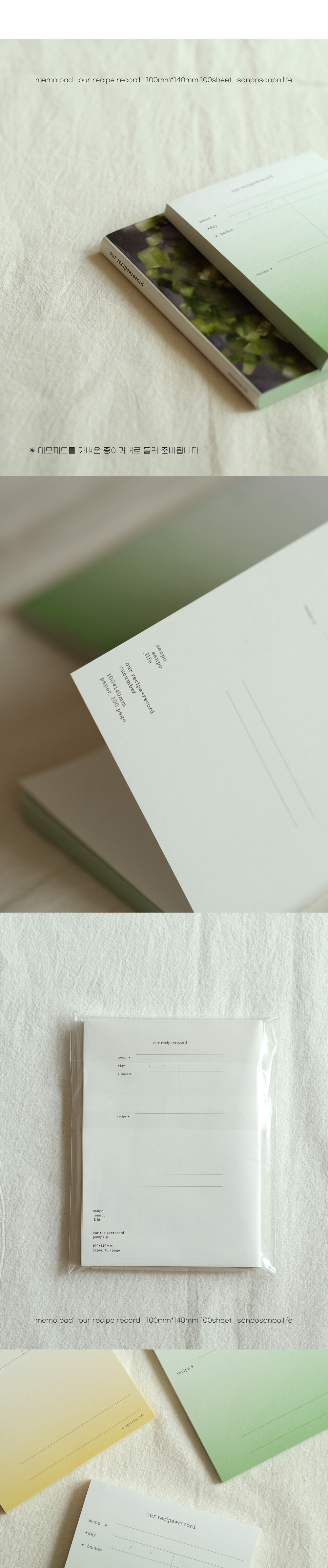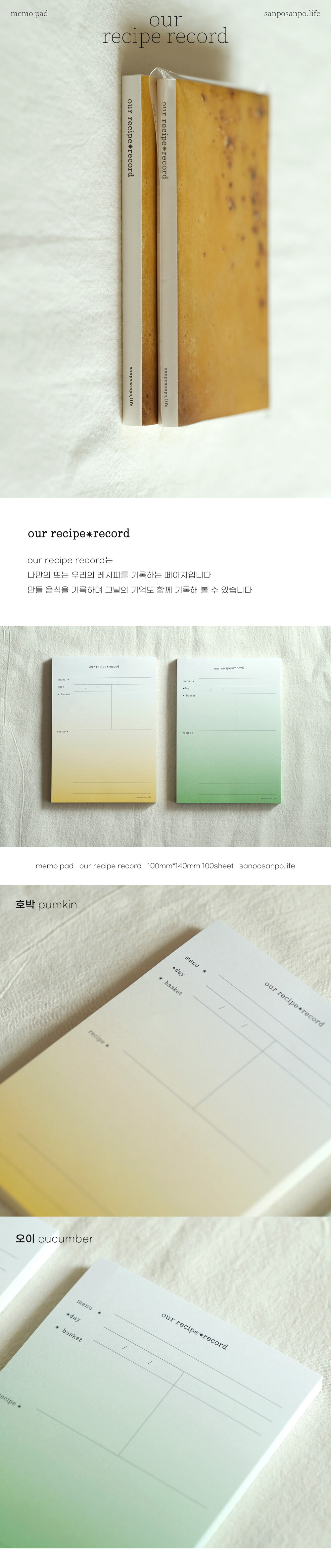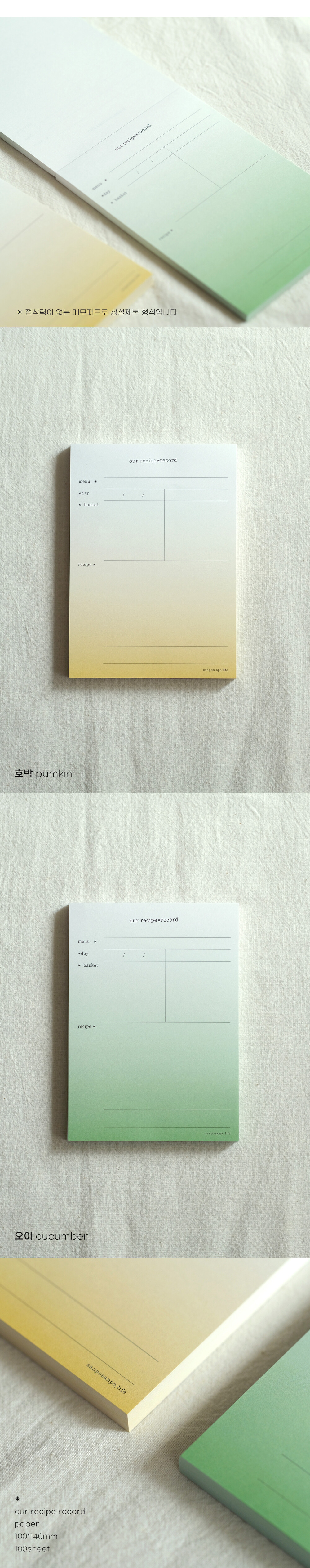 나만의 그리고 우리의 레시피를 기록하는 기록장입니다. 매일 만들지 않으면 잊기 쉬운 레시피를 적어두거나 유튜브에서 본 요리팁을 빠르게 적어두기에도 좋습니다. 접착력이 없는 메모패드로 상철제본되어있습니다. 작은 책처럼 라이트한 느낌의 종이 커버로 둘러 준비됩니다.